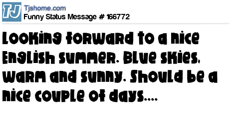X says Looking forward to a nice English summer. Blue skies, warm and sunny. Should be a nice couple of days....