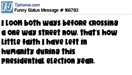 X says I look both ways before crossing a one way street now, that's how little faith I have left in humanity during this presidential election year.