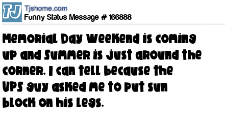 X says Memorial Day Weekend is coming up and Summer is just around the corner. I can tell because the UPS guy asked me to put sun block on his legs.