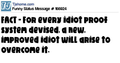 - # 99238 For every idiot proof system devised, a new and improved idiot will arise to overcome it.