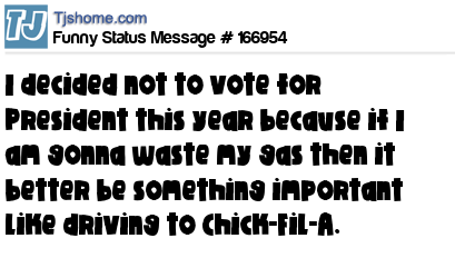 X says I decided not to vote for President this year because if I am gonna waste my gas then it better be something important like driving to Chick-Fil-A.