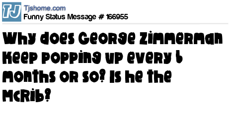 X says Why does George Zimmerman keep popping up every 6 months or so? Is he the McRib?