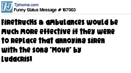 - # 81832 Firetrucks and ambulances would be much more effective if they were to replace that annoying siren with the song Move B!tch by Ludacris..