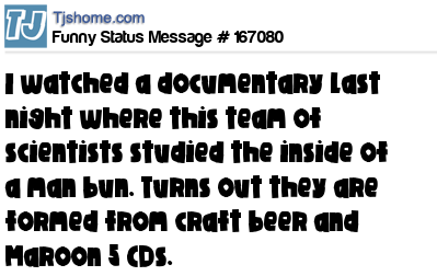 X says I watched a documentary last night where this team of scientists studied the inside of a man bun. Turns out they are formed from craft beer and Maroon 5 CDs.