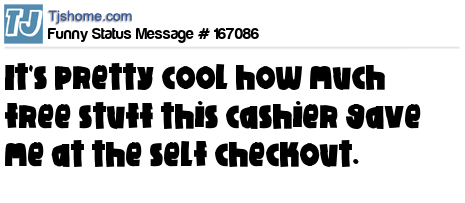 - # 167088 " It's pretty cool how much free stuff this cashier gave me at the self checkout. " From a cashier prone to joblessness and hopelessness.