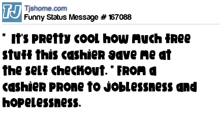 X " It's pretty cool how much free stuff this cashier gave me at the self checkout. " From a cashier prone to joblessness and hopelessness.