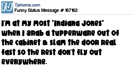 X says I'm at my most "Indiana Jones" when I grab a tupperware out of the cabinet & slam the door real fast so the rest don't fly out everywhere.