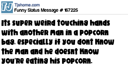 - # 189994 Its awkward touching hands with another man in a popcorn bag, especially if you don't know the man & he doesn't know you're eating his popcorn