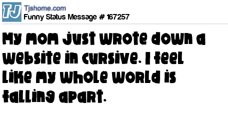 X says My mom just wrote down a website in cursive. I feel like my whole world is falling apart.