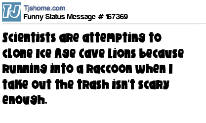X says Scientists are attempting to clone Ice Age Cave Lions because running into a raccoon when I take out the trash isn't scary enough.