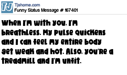X says When I'm with you, I'm breathless. My pulse quickens and I can feel my entire body get weak and hot. Also, you're a treadmill and I'm unfit.