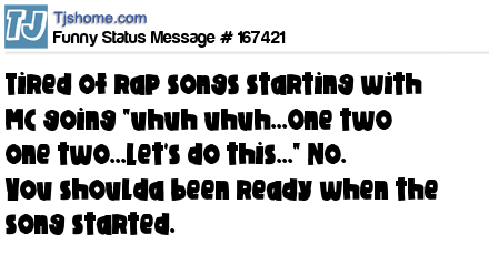 X says Tired of rap songs starting with MC going "uhuh uhuh...One two one two...Let's do this..." No. You shoulda been ready when the song started.