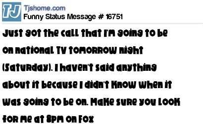 X just got the call that I'm going to be on national TV tomorrow night (Saturday). I haven't said anything about it because I didn't know when it was going to be on. Make sure you look for me at 8pm on Fox