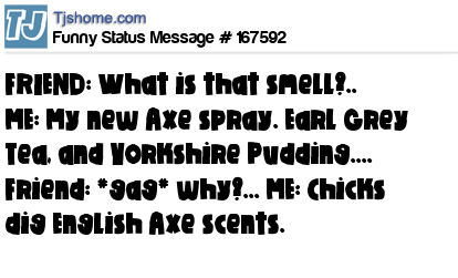 X says FRIEND: What is that smell?.. ME: My new Axe spray. Earl Grey Tea, and Yorkshire Pudding.... Friend: *gag* why?... ME: Chicks dig English Axe scents.