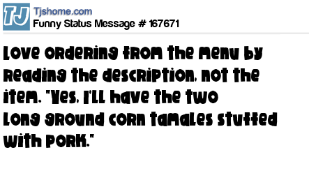 X says Love ordering from the menu by reading the description, not the item. "Yes, I'll have the two long ground corn tamales stuffed with pork."