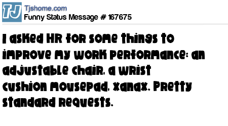 X says I asked HR for some things to improve my work performance: an adjustable chair, a wrist cushion mousepad, xanax. Pretty standard requests.