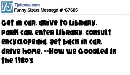 X says Get in car, drive to library, park car, enter library, consult encyclopedia, get back in car, drive home. --How we Googled in the 1980's