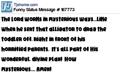X says The Lord works in mysterious ways...like when he sent that alligator to drag the toddler off, right in front of his horrified parents. It's all part of His wonderful, divine plan! How mysterious.... Amen!