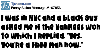 X says I was in NYC and a black guy asked me if the Yankees won to which I replied, "Yes. You're a free man now."
