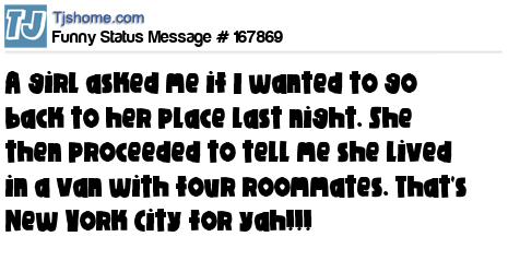 X says A girl asked me if I wanted to go back to her place last night. She then proceeded to tell me she lived in a van with four roommates. That's New York City for yah!!!
