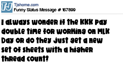 X says I always wonder if the KKK pay double time for working on MLK Day or do they just get a new set of sheets with a higher thread count?