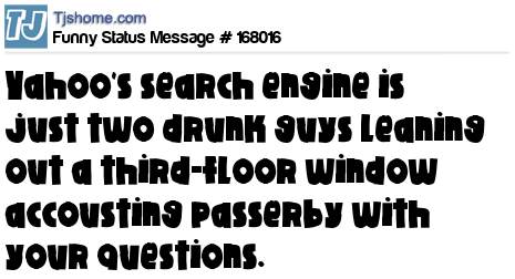 X says Yahoo's search engine is just two drunk guys leaning out a third-floor window accousting passerby with your questions.