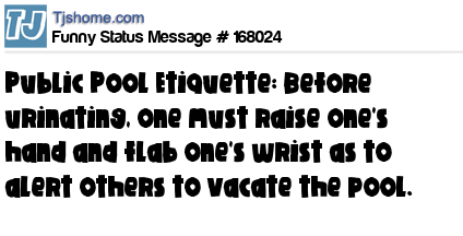 X says Public Pool Etiquette: Before urinating, one must raise one's hand and flab one's wrist as to alert others to vacate the pool.