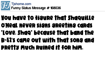 - # 149783 I bet Shaquille O'neil hates to sign anything, "Love,Shaq".....because the B52s pretty much ruined that for him...