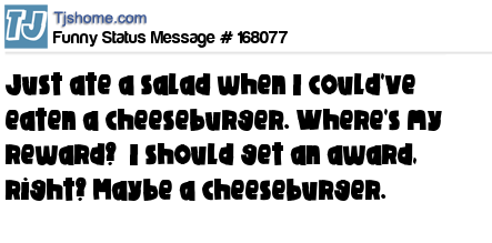 X says Just ate a salad when I could've eaten a cheeseburger. Where's my reward? I should get an award, right? Maybe a cheeseburger.