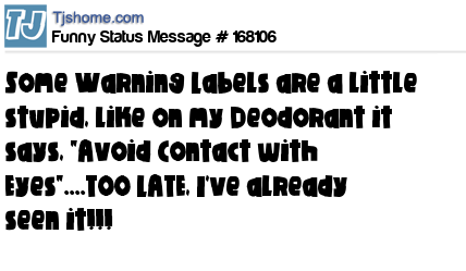 - # 104288 Some Warning Labels are a little retarded, like on my Deodorant it says, "Avoid Contact with Eyes"....TOO LATE, I've already seen it!!!