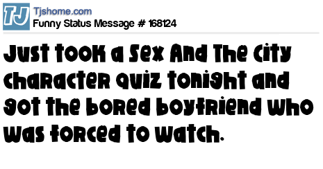 X says Just took a Sex And The City character quiz tonight and got the bored boyfriend who was forced to watch.