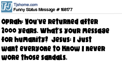 X says Oprah: You've returned after 2000 years. What's your message for humanity?  Jesus: I just want everyone to know I never wore those sandals.