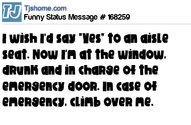 X says I wish I'd say "Yes" to an aisle seat. Now I'm at the window, drunk and in charge of the emergency door. In case of emergency, climb over me.