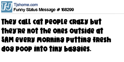 X says They call cat people crazy but they're not the ones outside at 5AM every morning putting fresh dog poop into tiny baggies.