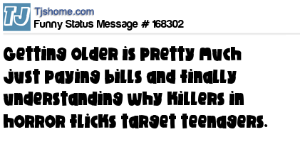 X says Getting older is pretty much just paying bills and finally understanding why killers in horror flicks target teenagers.