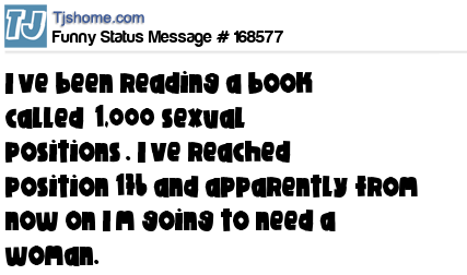 - # 90758 I've been reading a book called '1,000 sexual positions'. I've reached position 176 and apparently from now on I'm going to need a woman.