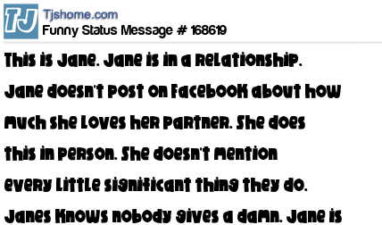 X says This is Jane. Jane is in a relationship. Jane doesn't post on Facebook about how much she loves her partner. She does this in person. She doesn't mention every little significant thing they do. Janes knows nobody gives a damn. Jane is smart. Be like Jane.