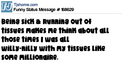X says Being sick & running out of tissues makes me think about all those times I was all willy-nilly with my tissues like some millionaire.