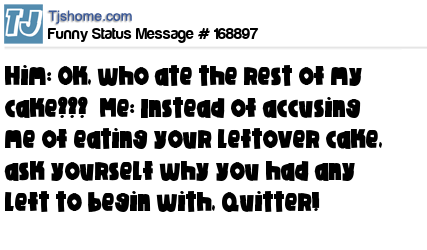 X says Him: Ok, who ate the rest of my cake???  Me: Instead of accusing me of eating your leftover cake, ask yourself why you had any left to begin with, Quitter!