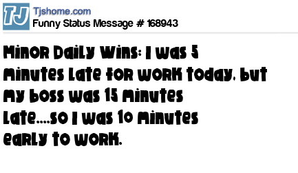 X says Minor Daily Wins: I was 5 minutes late for work today, but my boss was 15 minutes late....so I was 10 minutes early to work.