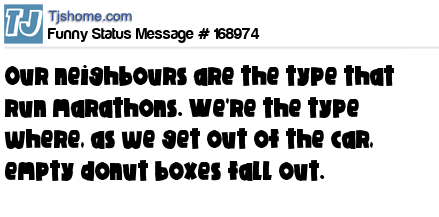X says Our neighbours are the type that run marathons. We're the type where, as we get out of the car, empty donut boxes fall out.
