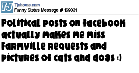 X says Political posts on facebook actually makes me miss Farmville requests and pictures of cats and dogs :)