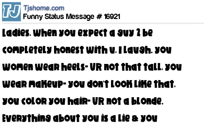 X Ladies, when you expect a guy 2 be completely honest with u, I laugh. you women wear heels- UR not that tall, you wear makeup- you don't look like that, you color you hair- UR not a blonde. Everything about you is a lie & you expect a man to tell you the