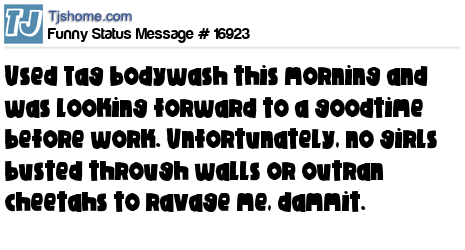 X used Tag bodywash this morning and was looking forward to a goodtime before work. Unfortunately, no girls busted through walls or outran cheetahs to ravage me, dammit.