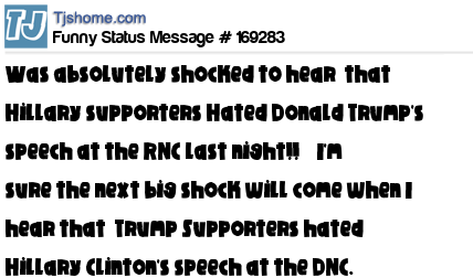 X says Was absolutely shocked to hear that Hillary supporters Hated Donald Trump's speech at the RNC last night!! I'm sure the next big shock will come when I hear that Trump Supporters hated Hillary Clinton's speech at the DNC.