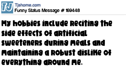 X says My hobbies include reciting the side effects of artificial sweeteners during meals and maintaining a robust dislike of everything around me.