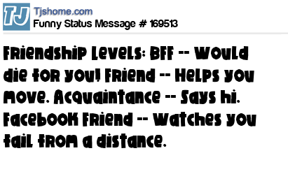 X says Friendship Levels: BFF -- Would die for you! Friend -- Helps you move. Acquaintance -- Says hi. Facebook Friend -- Watches you fail from a distance.