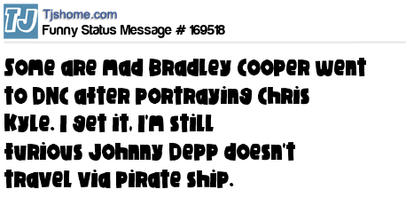 X says Some are mad Bradley Cooper went to DNC after portraying Chris Kyle. I get it, I'm still furious Johnny Depp doesn't travel via pirate ship.