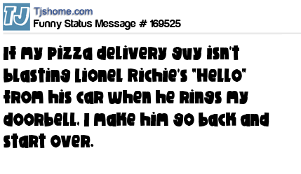X says If my pizza delivery guy isn't blasting Lionel Richie's "Hello" from his car when he rings my doorbell, I make him go back and start over.