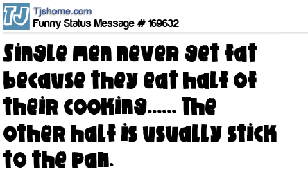 X says Single men never get fat because they eat half of their cooking...... The other half is usually stick to the pan.